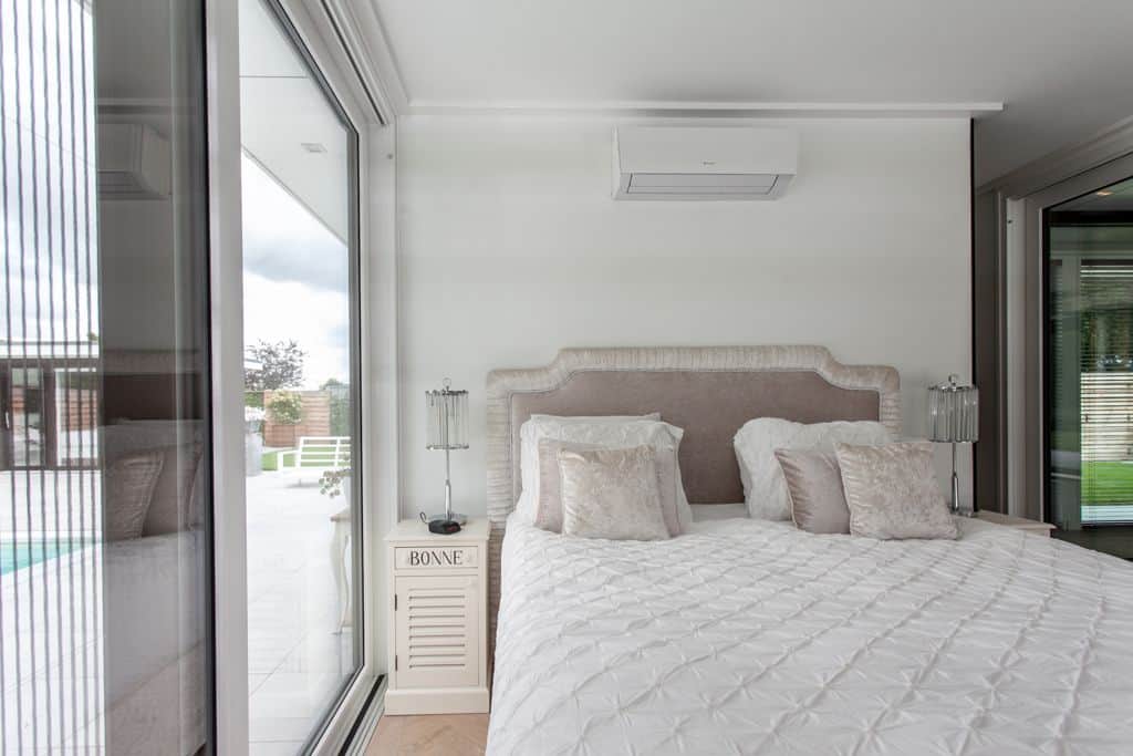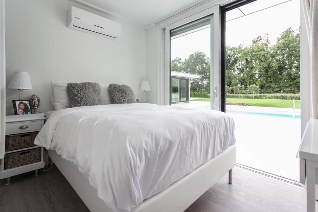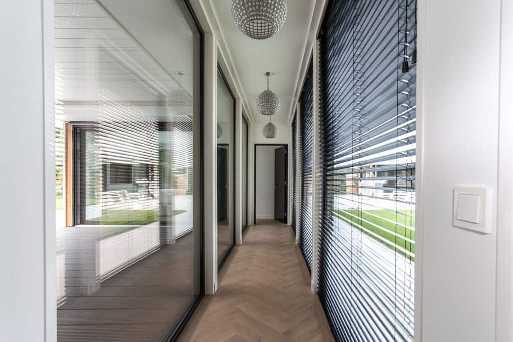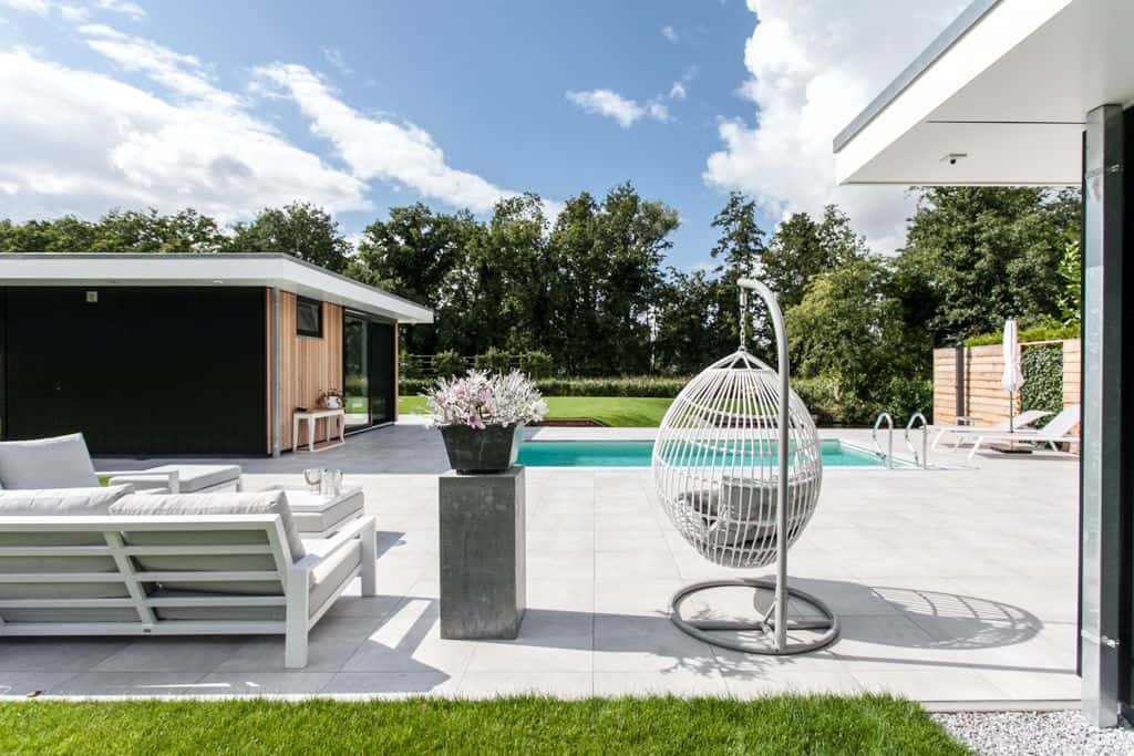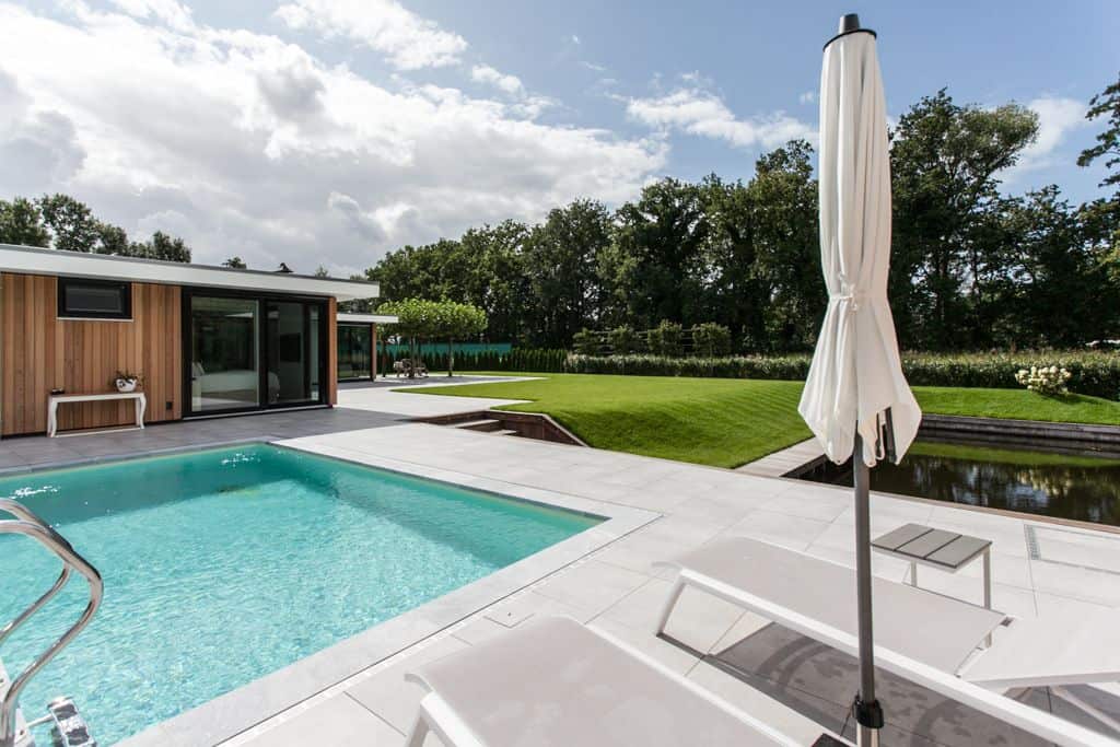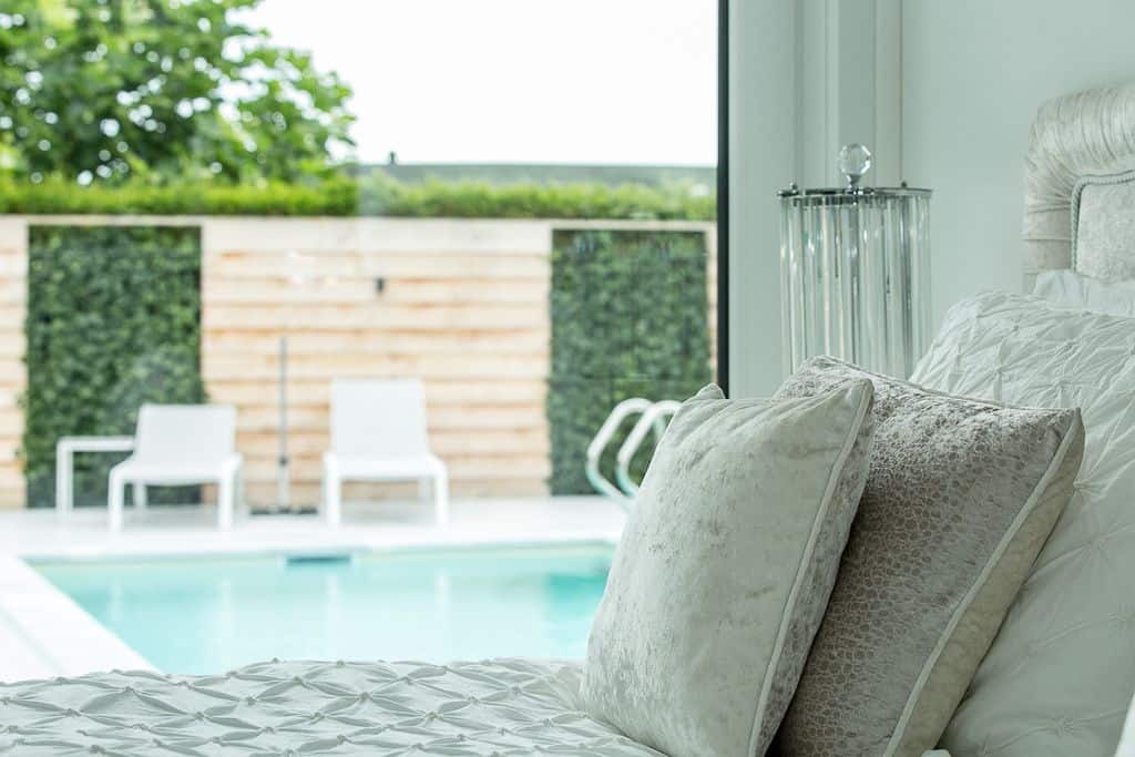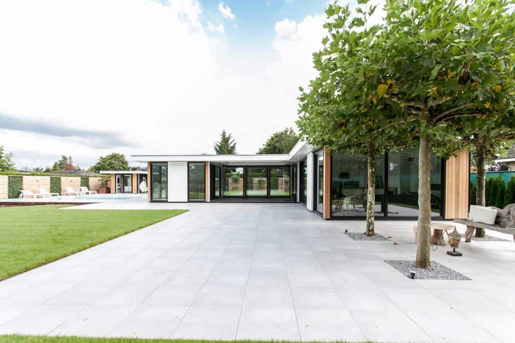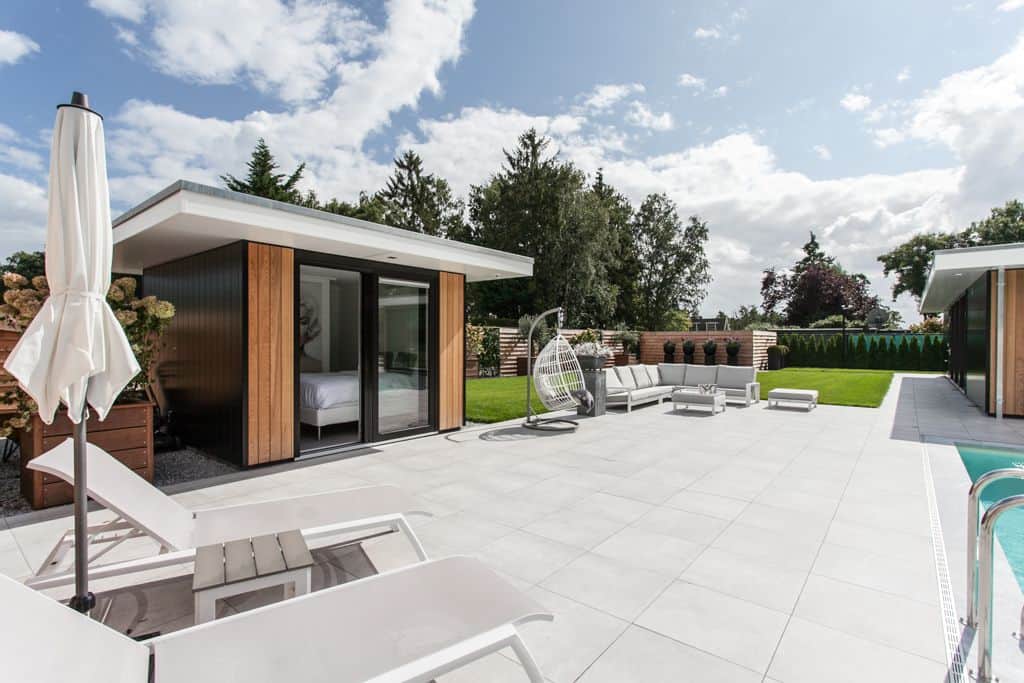 Het is niet zomaar een woning van het type Quadro, want de eigenaren kozen ervoor om midden in het chalet een groot overdekt buitenterras te creëren. Naast de royale woonkamer met luxe keuken en een uitloop naar het terras, is de woning voorzien van twee slaapkamers, waarvan een slaapkamer is ingericht als inloopkledingkast. Verder heeft het een moderne badkamer, een opslagruimte en een apart tweede toilet. Los van de woning staat een gastenhuis voor hun dochter. Vanuit dat gastenhuis kijk zij uit over het buitenzwembad met zoutwatervoorziening en buitendouche.