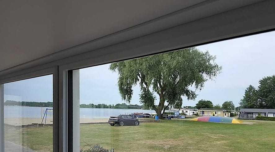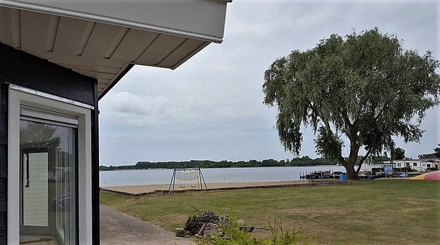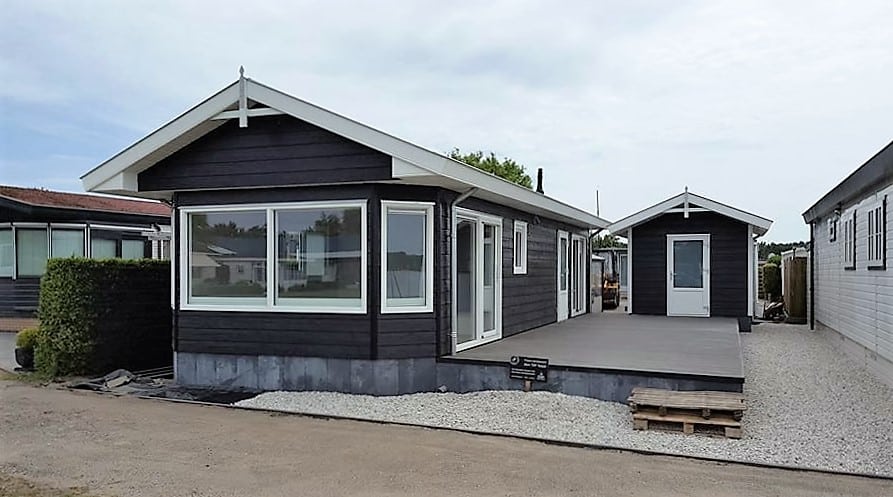 Dit chalet (model Ontario) staat op Veluwe Strandbad in Elburg met uitzicht over het Veluwemeer. De kleurstelling, materiaalkeuze maar ook het hele ontwerp is volledig op maat en naar wens. De aangrenzende veranda en de berging die volledig in stijl zijn uitgevoerd, maken het helemaal af.