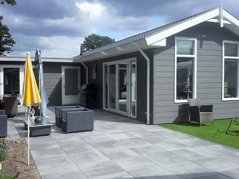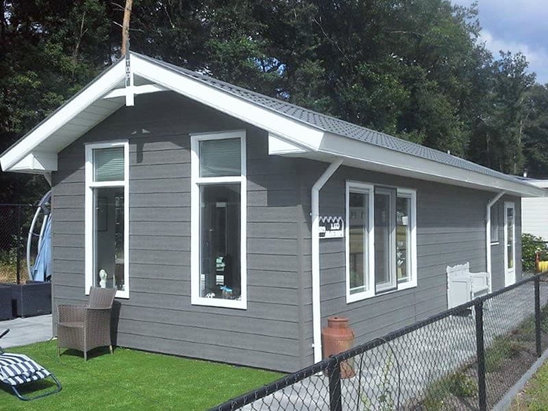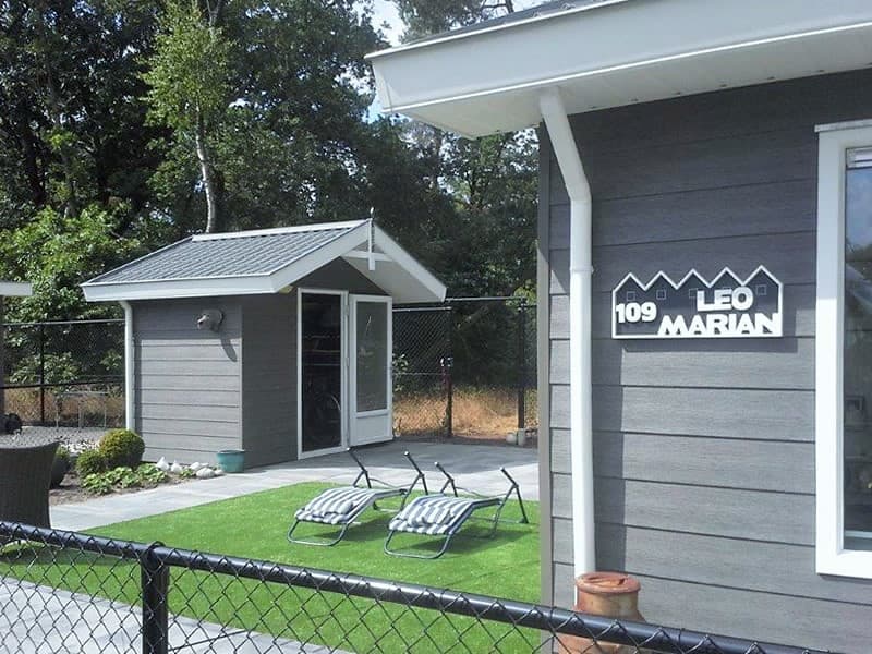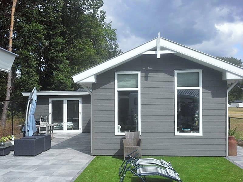 Chalet met aanbouw en aparte berging in Arcen. De recreatiewoning is uitgevoerd in een moderne lichtgrijze kleur met witte accenten. Dankzij de aanbouw biedt de woonoppervlakte (69 m2) meer dan voldoende leefruimte. De hoge raampartijen en het schuine dak zorgen voor een extra ruimtelijk effect. Het zorgvuldig aangelegde terras maakt het geheel tot een fantastische recreatieplek.