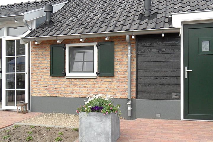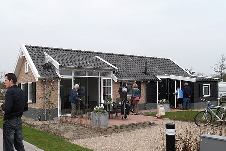 Sfeer zit hem vaak in details. Neem nou dit chalet in Ginsterveld, gebaseerd op model Colorado. Deze woning heeft een verhoogd dak boven de openslaande deuren. Dat geeft niet alleen een speels effect aan de gevel, maar zorgt meteen voor meer daglicht en een optimaal uitzicht. Andere sfeermakers in deze woning zijn bijvoorbeeld de puntgevel en het hoge plafond in de woonkamer.Ook is hier gekozen voor een stenen buitenmuur in plaats van onderhoudsarm materiaal met houtstructuur.