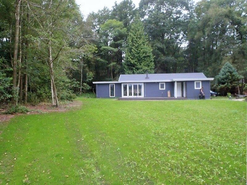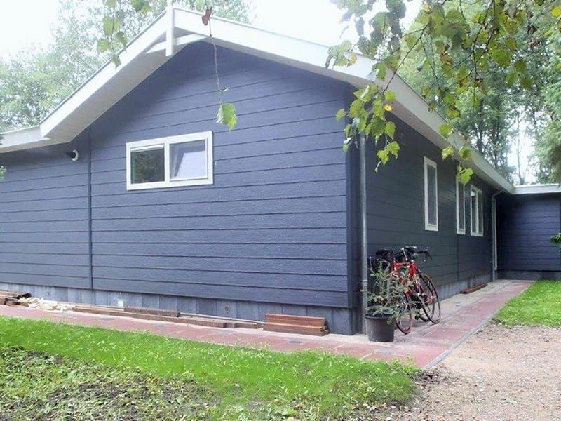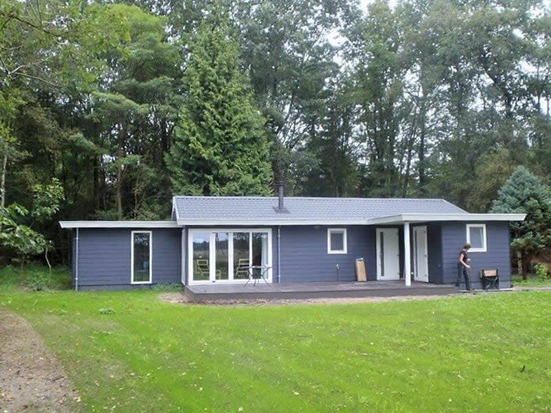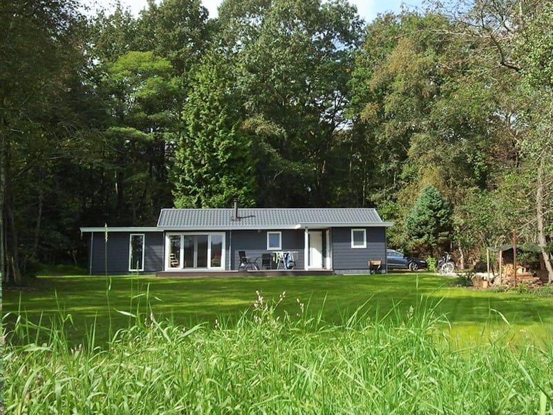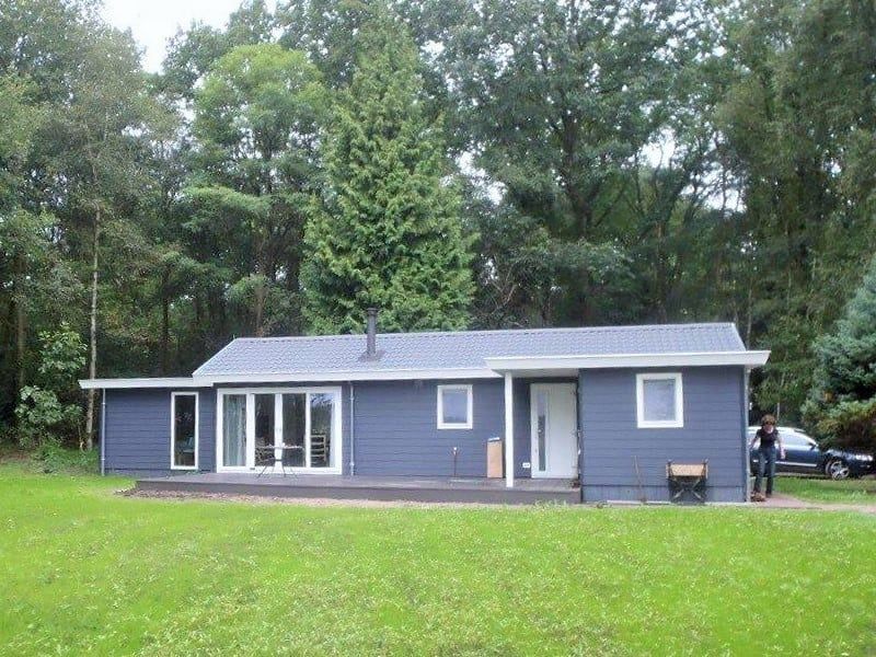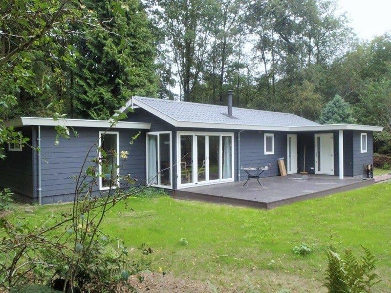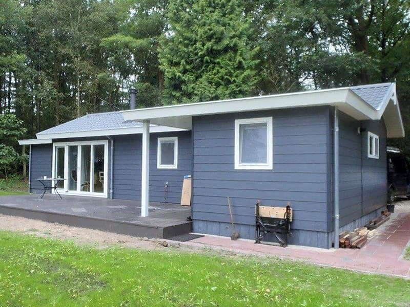 Dit charmante chalet oogt veel groter dan de 55 vierkante meter die het op zijn naam heeft staan. Dat komt onder andere door de glazen pui, waardoor je vanuit het woongedeelte zo het terras oploopt. Ook de luifel en het puntdak geven het chalet net dat beetje extra. De buitenwanden zijn uitgevoerd in onderhoudsarm materiaal met houtnerf en een modern lichtgrijze kleurstelling.