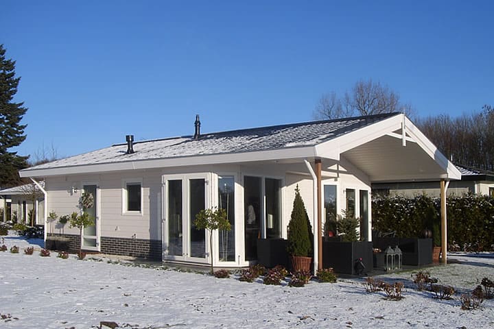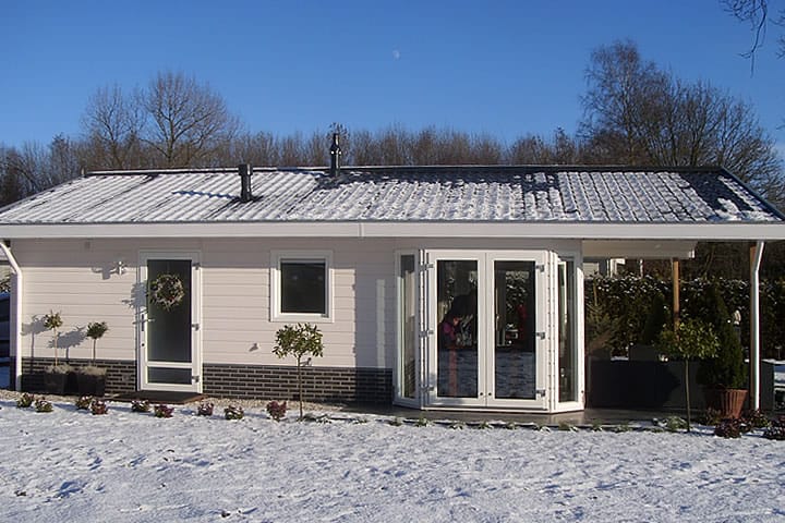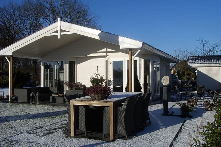 Een glazen hoekchalet is een van de meest bestelde extra opties. Logisch, want deze eyecatcher geeft uw chalet direct een upgrade. Bij deze recreatiewoning op TOP Park Florinata hebben we ook de dakrand wat verder laten doorlopen. Daardoor ontstaat er een sfeervolle overkapping boven het terras.