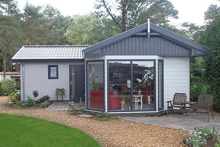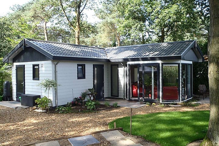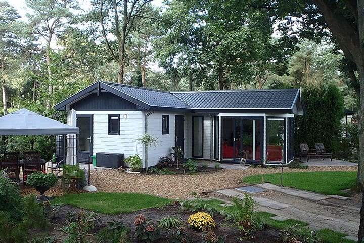 Als je op zo’n mooi plekje zit, wil je daar natuurlijk zoveel mogelijk van genieten. Dit chalet in Ede is daarom voorzien van een fraaie glazen erker waardoor het uitzicht optimaal is. De recreatiewoning heeft een L-vorm en een klassiek puntdak. Een heerlijk ruim boshuis is het geworden, met veel ruimte en alle comfort.