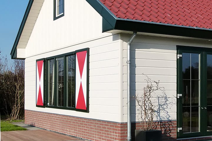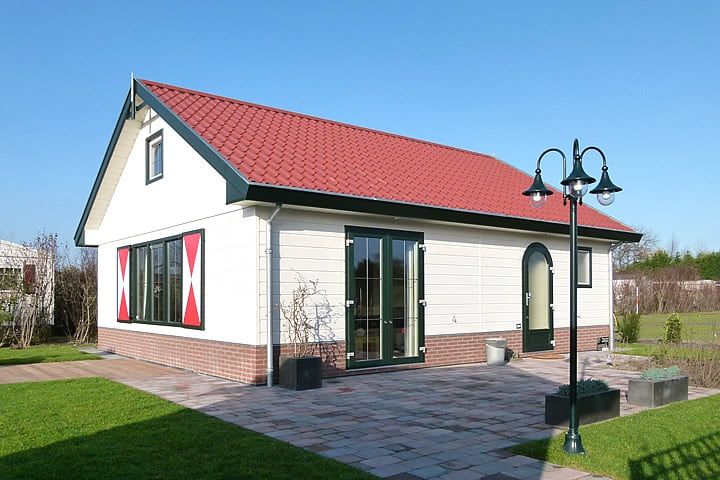 Chalet Manitoba met etage biedt plaats aan minimaal 6 personen. De eigenaar heeft gekozen voor een klassieke Hollandse uitstraling, met traditionele luiken, een wit afgewerkte buitenwand en terracotta dakpannen.