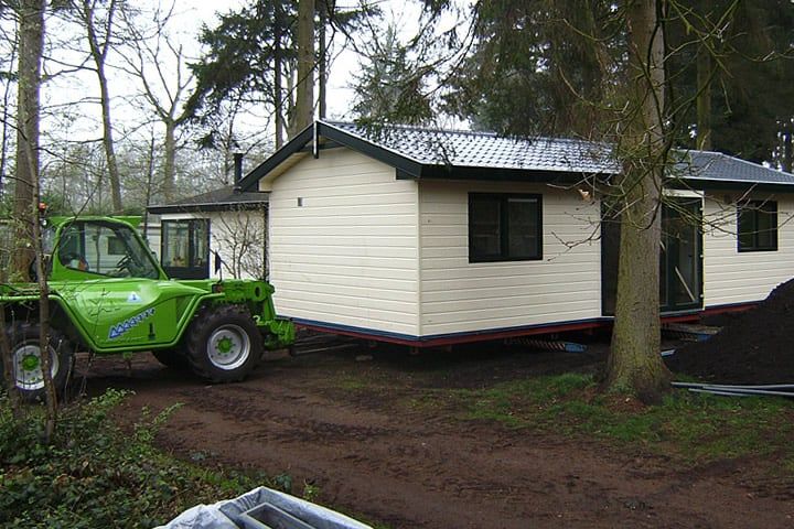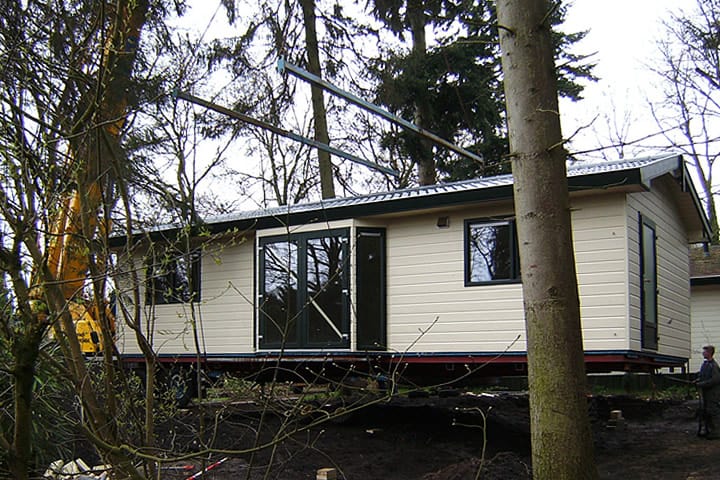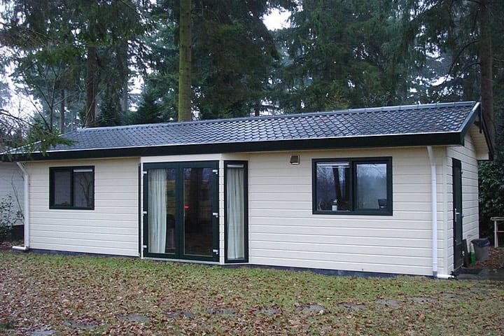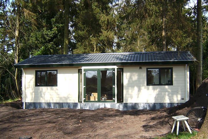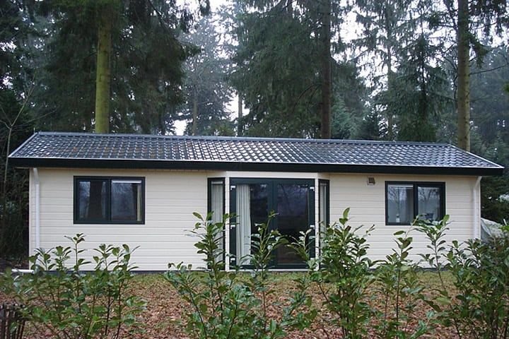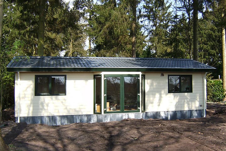 Bij TOP Totaal zijn we wel wat gewend. Dus toen de opdrachtgever ons vroeg om dit chalet middenin het bos tussen de bomen te plaatsen, draaiden wij daar onze hand niet voor om. En dan is recreatiechalet Ontario nog niet eens ons kleinste model! Overigens is dit vakantiehuis uitgevoerd met een glazen erker en dubbele openslaande deuren. Prachtig uitzicht op de omgeving!