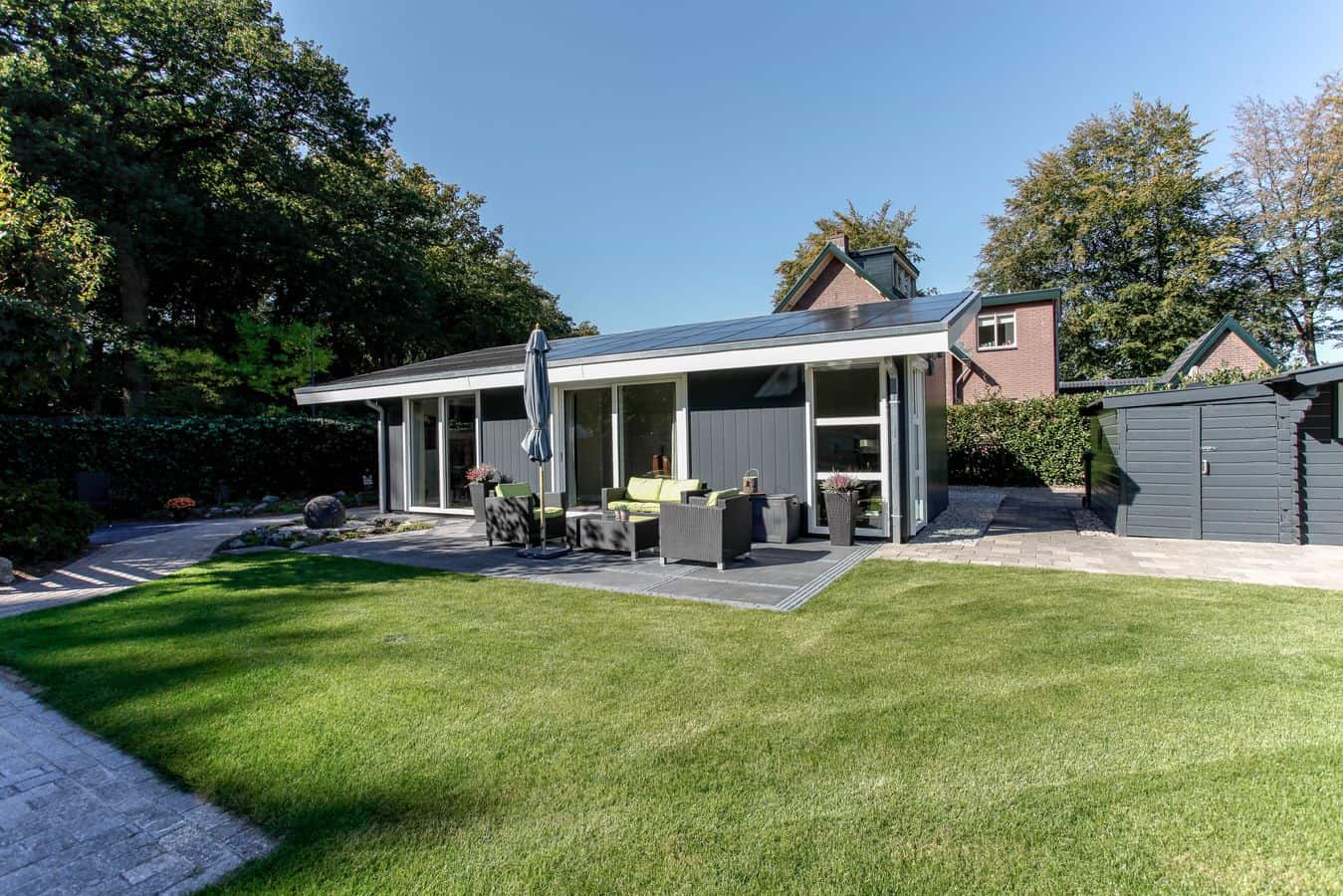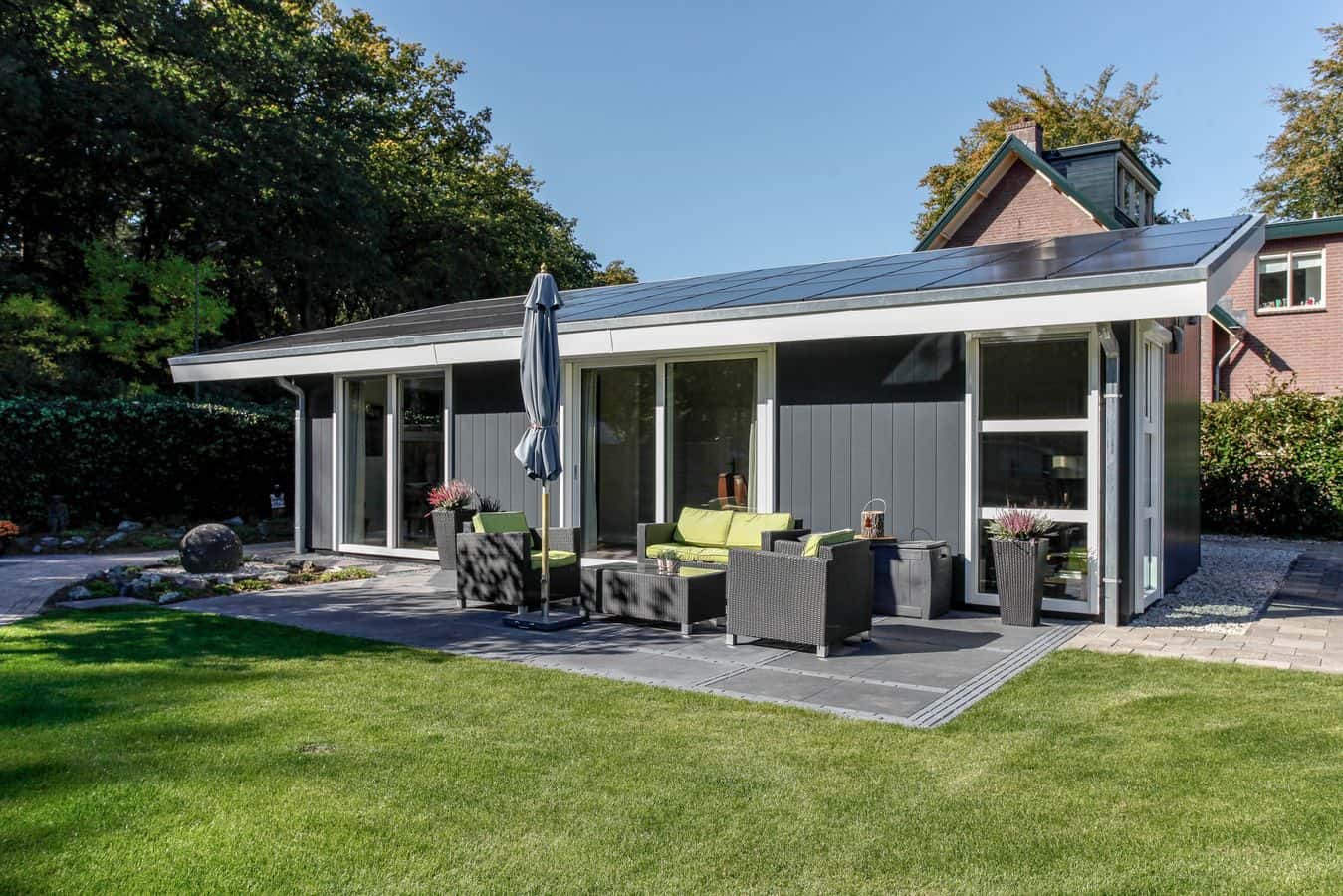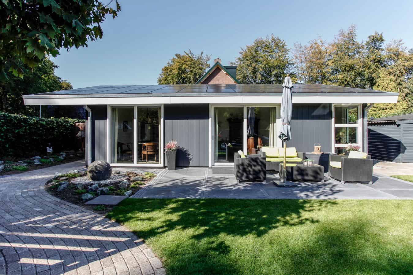 Deze mantelzorgwoning is uitgevoerd met een lessenaarsdak die volledig is voorzien van zonnepanelen.