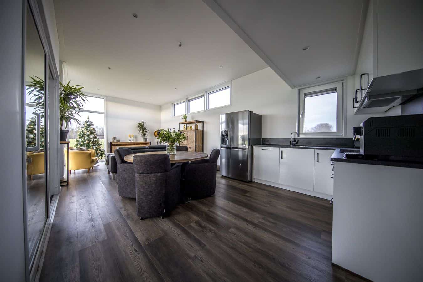 De woning beschikt over een verhoogd deel voor nog meer ruimte beleving. Een riante slaapkamer, die ook toegang heeft tot de badkamer. Een apart toilet, een riante lamellenoverkapping, vloerverwarming en nog veel meer.