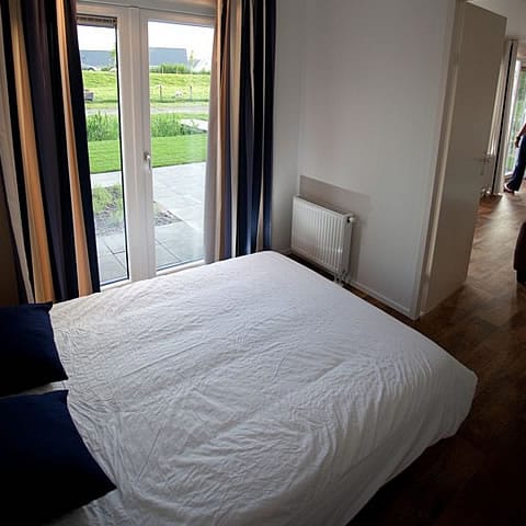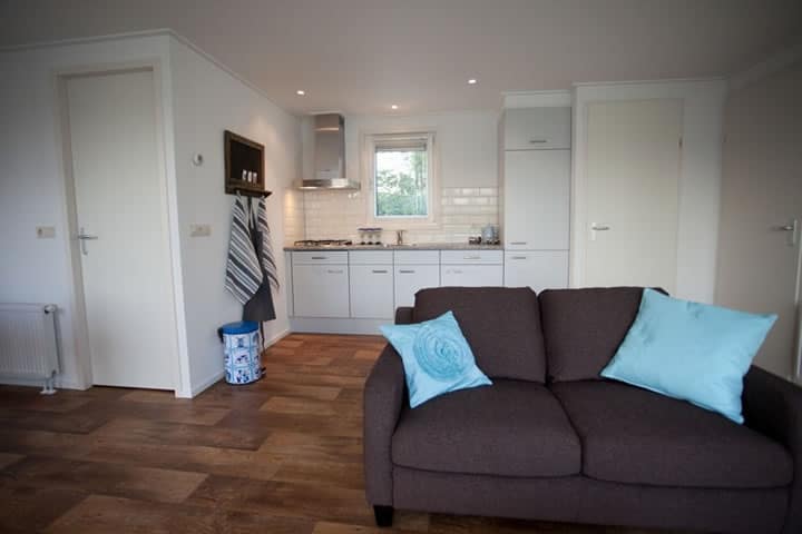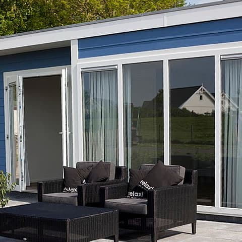 Stelt u zich eens voor: wakker worden, deuren open en zo de tuin inlopen om te genieten van het uitzicht. Dit chalet (type Ontario) is voorzien van maar liefst drie dubbele openslaande deuren die rechtstreeks toegang geven tot het terras. De hoge ramen zorgen voor een panoramisch uitzicht en lekker veel daglicht. ’s Nachts kunt u vanaf de bank en vanuit bed de sterren zien!