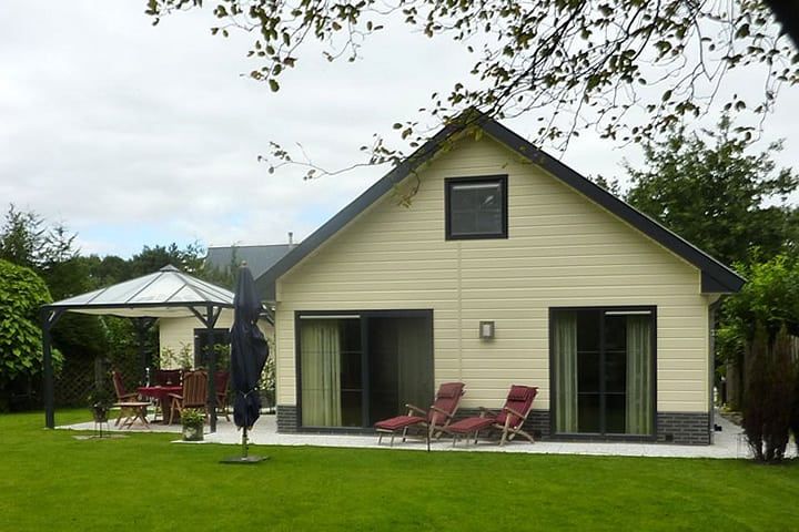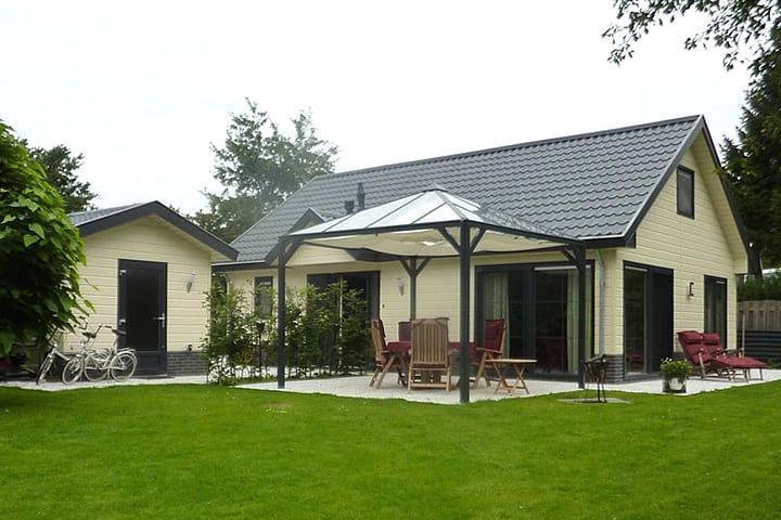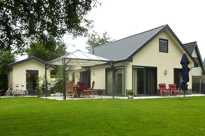 Onze enkele chalets zijn al aardig groot en comfortabel. Maar als je daar twee van naast elkaar plaatst, ontstaat er werkelijk een zee van ruimte. Dit chalet met etage is daar een goed voorbeeld van. Naast het vakantiehuis is een overkapping geplaatst met een dak in hooibergstijl. Daardoor ontstaat er een fantastisch beschut terras dat de ruimte van Manitoba nog eens extra benadrukt.