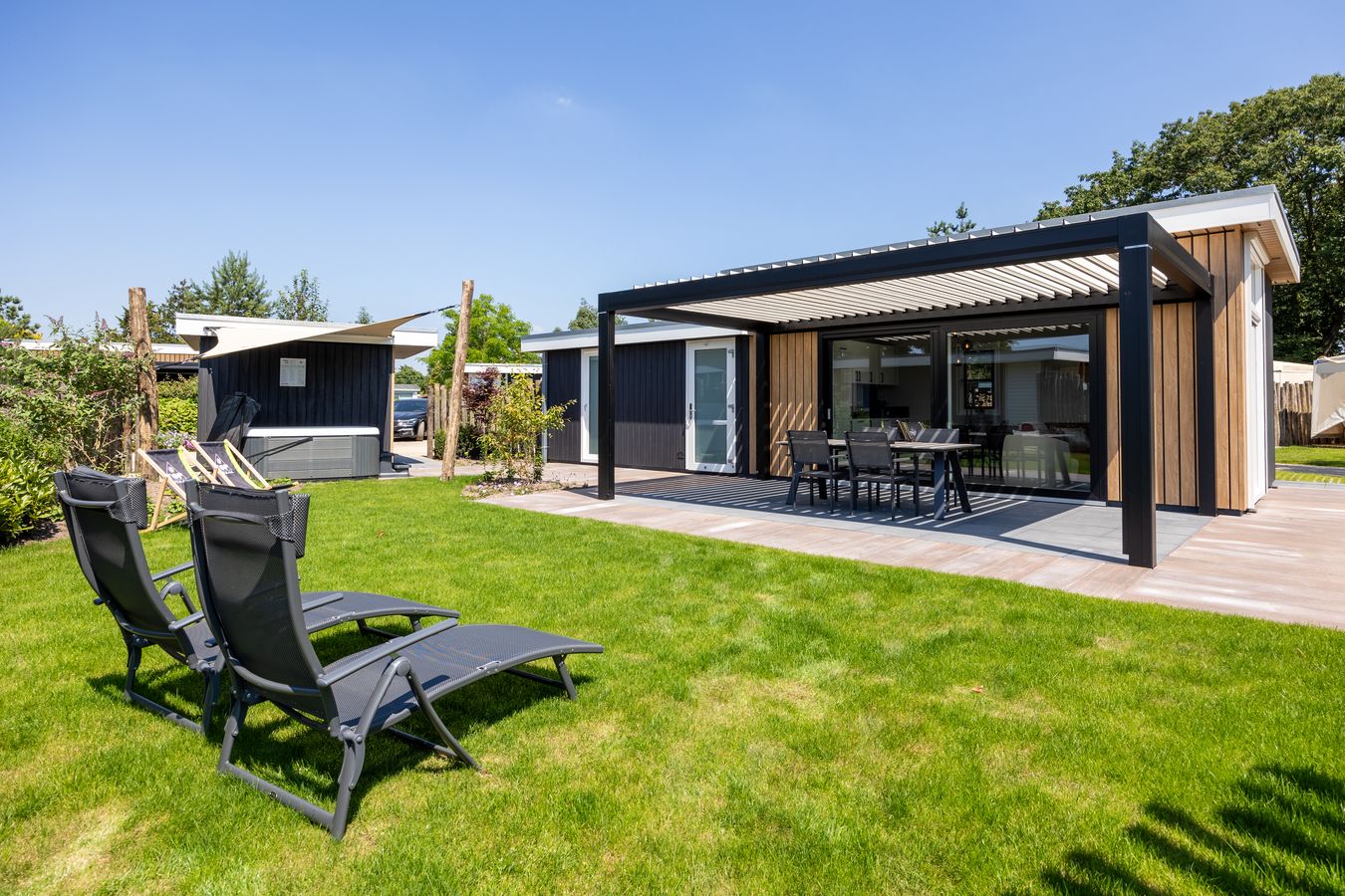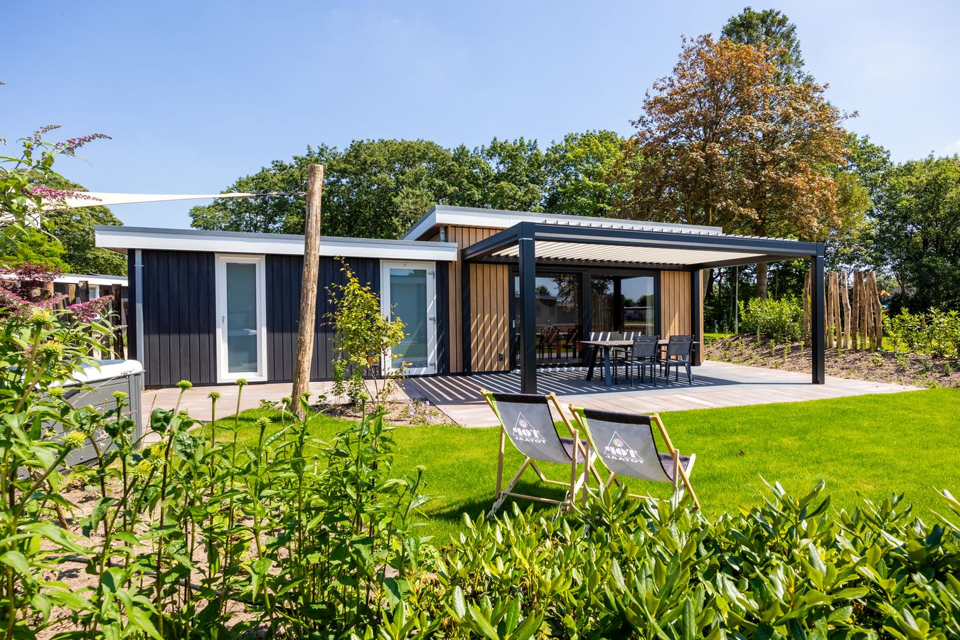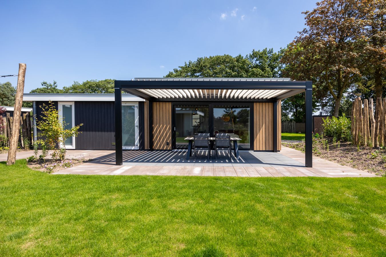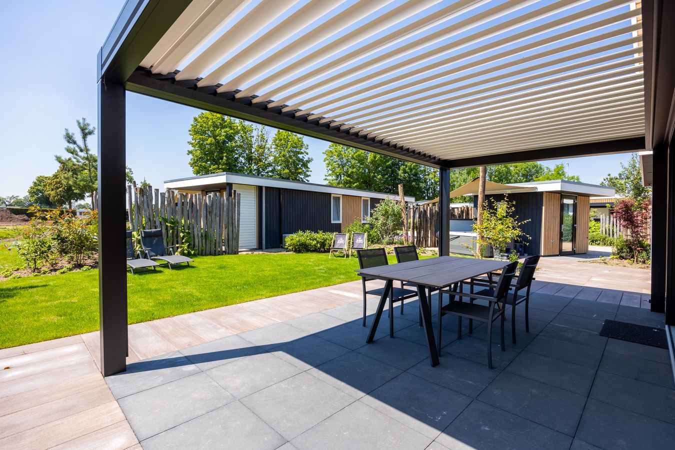 Een prachtige recreatievilla met een lamellenoverkapping. Deze villa staat op ons familiepark in Voorthuizen en is voorzien van het (verplichte!) energielabel A+ of hoger.