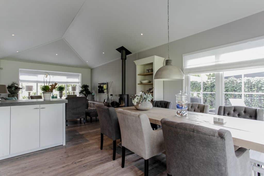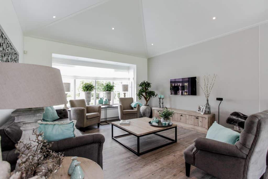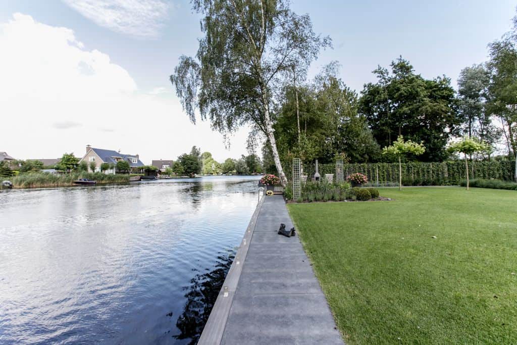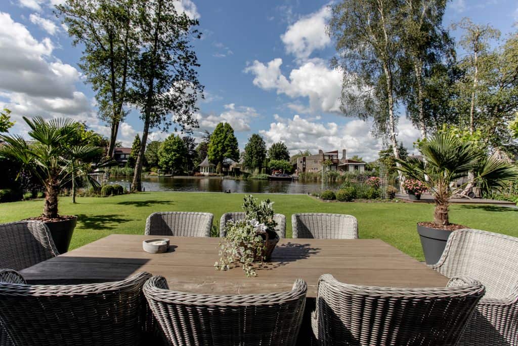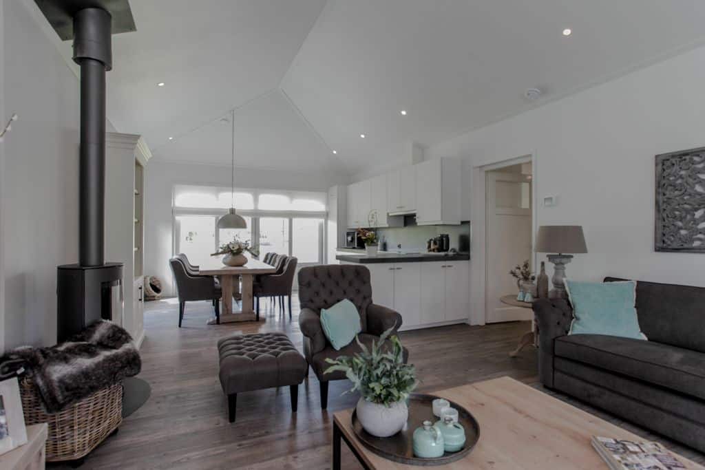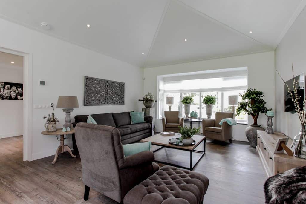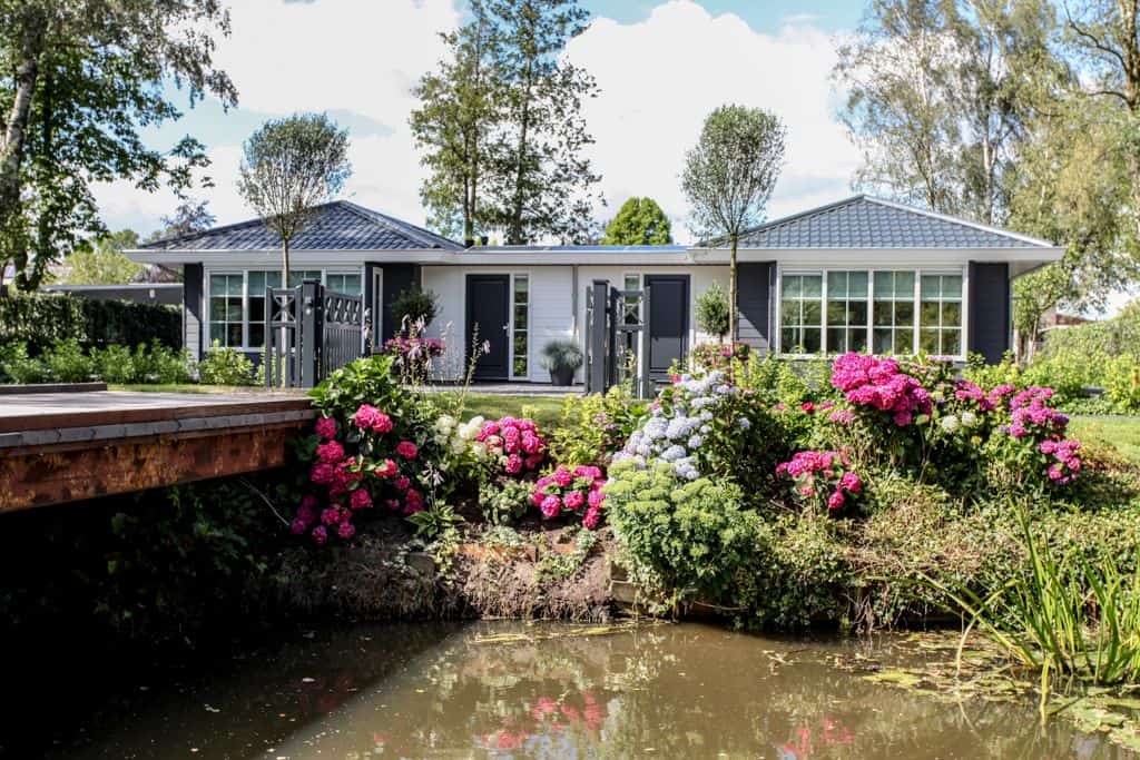 ‘We hadden geluk dat we dit stukje grond konden aanschaffen,’ zegt de klant. ‘Voorheen woonden wij in een prachtig oud gemaal, maar toen onze kinderen de deur uitgingen, was het letterlijk leeg. We hebben de 2000 kub grote, compleet verbouwde woning verkocht en wilden iets kleins terug met minder onderhoud. Via-via kwamen we in contact met TOP Totaal en we waren direct verkocht. Van dit prachtige plekje, gelegen aan de Giessen – een zijtak van de Merwede – wilden we een unieke en gezellige plek maken, met voldoende privacy en ruimte voor onze kleinkinderen. Het liefst in landelijke stijl. En dat is hun zeker gelukt. De landelijke kleuren en inrichting van de woning zijn tot in detail doorgevoerd. De prachtige tuin heeft veel beschutte plekjes en een fijn terras waar je heerlijk kunt zitten.’