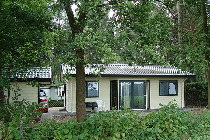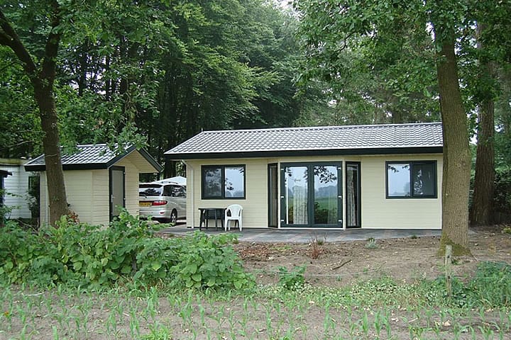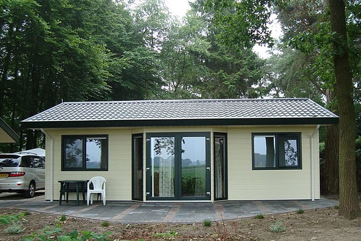 Dubbelbreed chalet Manitoba, uitgevoerd met een fraaie zij-erker met hoge ramen. Wist u dat onze chalets standaard voorzien zijn van HR++ glas? Zo blijft het ook in de winter binnen behaaglijk. Wilt u nog meer comfort, dan kunt u kiezen voor een vloerverwarming in plaats van een centrale verwarming. De warmte verspreid zich dan heel gelijkmatig door de kamers.