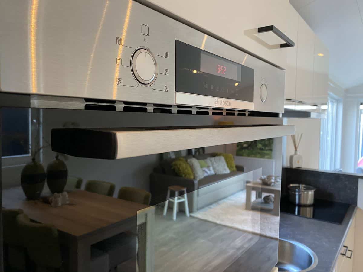De luxe keuken (voorzien van Bosch inbouwapparatuur: vaatwasser, combimagnetron) grenst aan de woon-/eetkamer. Het extra hoge plafond in de woonkamer (plafond tot in de nok) zorgt voor nog meer ruimte beleving.