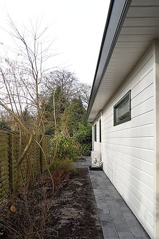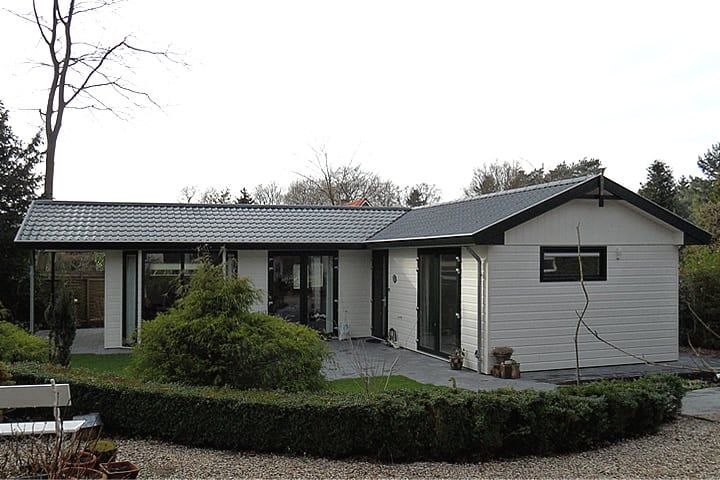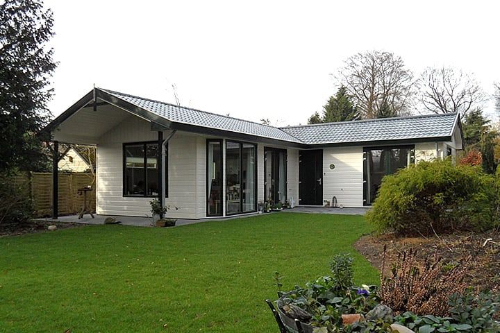 Dit zorgchalet op de Veluwe is geplaatst in de achtertuin van de mantelzorgers. U heeft daar overigens geen vergunning meer voor nodig! Het hoekchalet is gebaseerd op type Alberta, een van onze meest geliefde chalettypen. De mantelzorgwoning is qua afwerking aan de buiten afgestemd op de stijl van de hoofdwoning. De indeling is aangepast aan de zorgbehoeften.