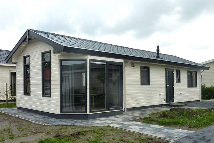 Een fraaie erker geeft uw chalet absoluut meerwaarde, al was het alleen al om het mooie uitzucht dat u vanaf de bank heeft! Dit chalet hebben we verder afgewerkt met witte houtdelen en dakpannen in een contrasterende kleur.